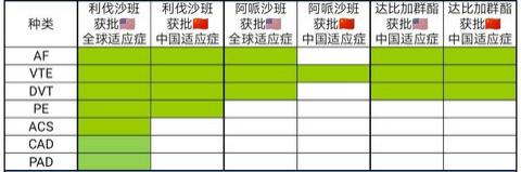 新一代口服抗凝藥物獲批適應癥比較