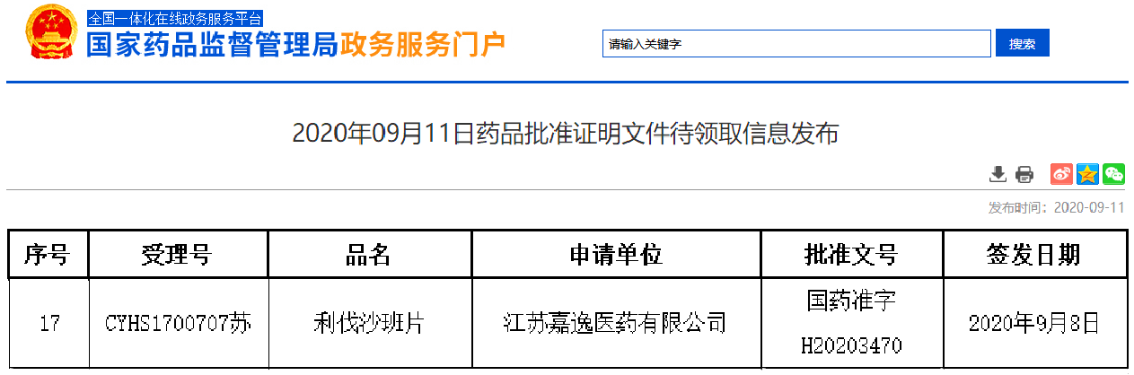 2020年9月11日,嘉逸醫(yī)藥高難度仿制藥利伐沙班片(商品名:逸樂通)的藥品批準證明文件獲得國家藥品監(jiān)督管理局公示發(fā)布。